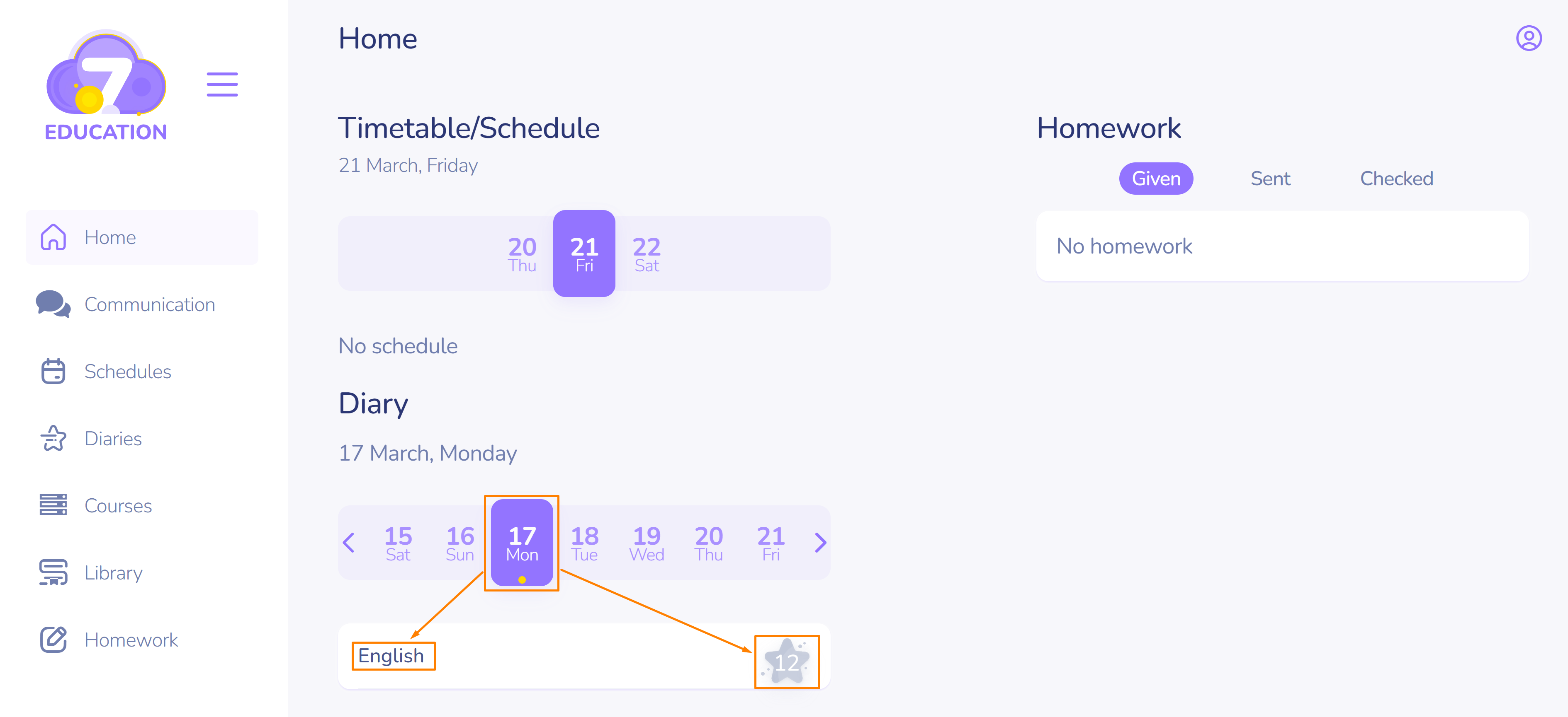 The sudent's Diaries page contains the same information.
