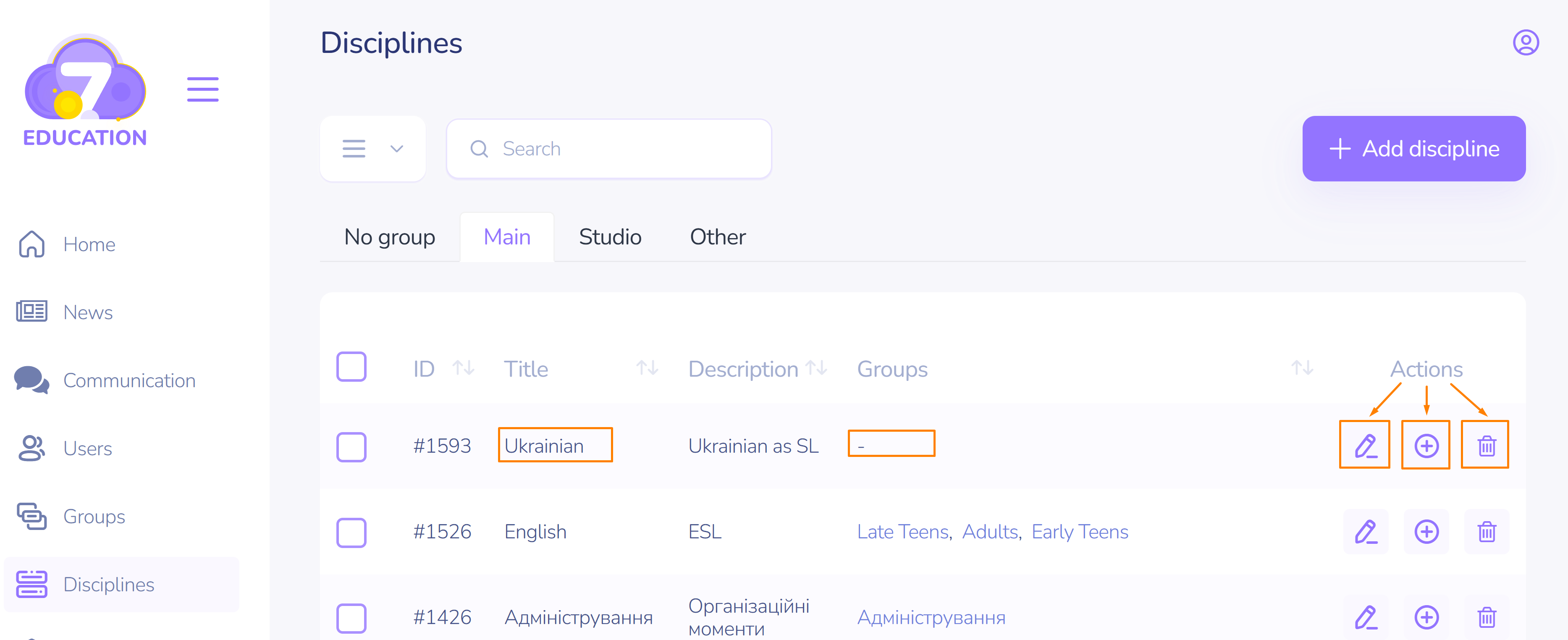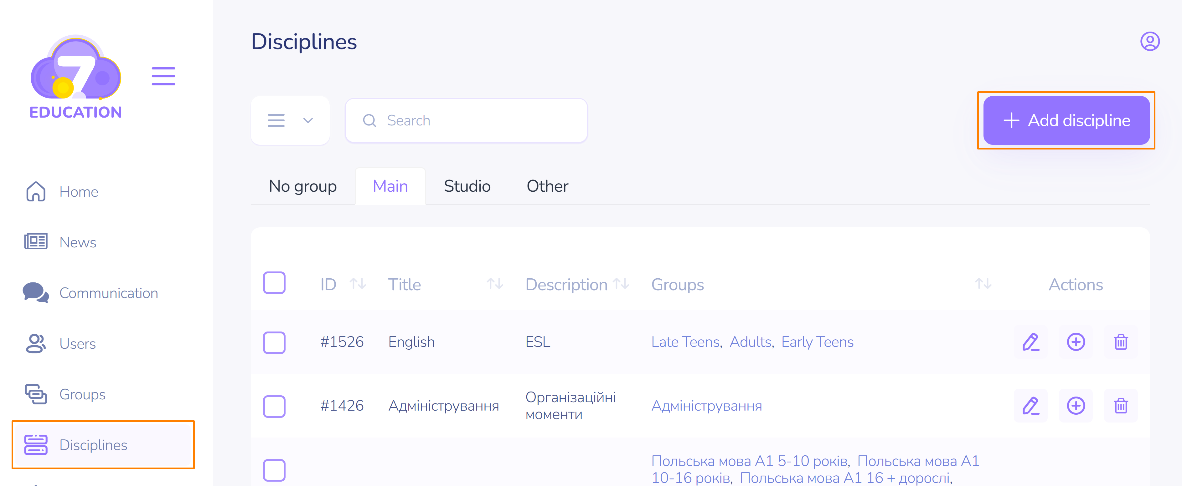 If necessary, the discipline can be edited (change the name, description, type), groups of users can be enrolled/dropped, or it can be deleted using the corresponding option in the Actions section on the right in the row with the discipline name.