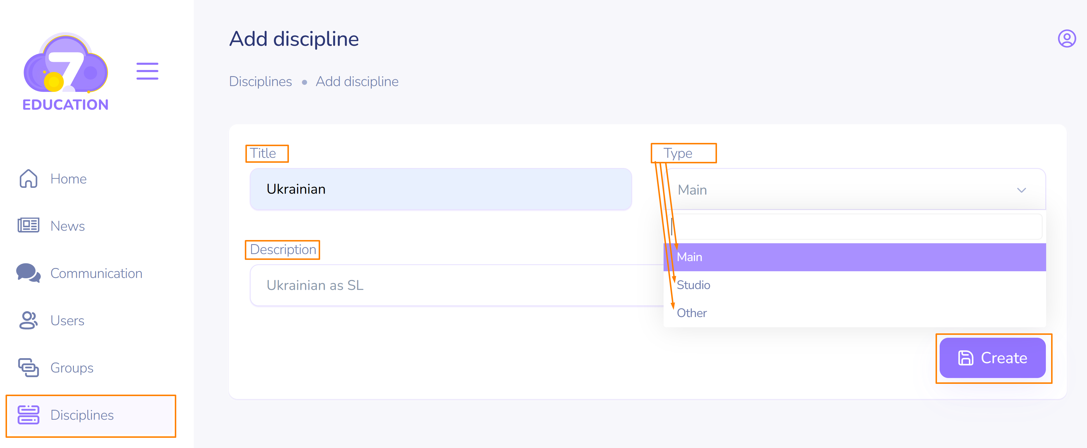 This category is linked to Groups, Lessons, and Curriculum, so it is crucial to create the discipline(s) during the preparatory stage of setting up the institution: