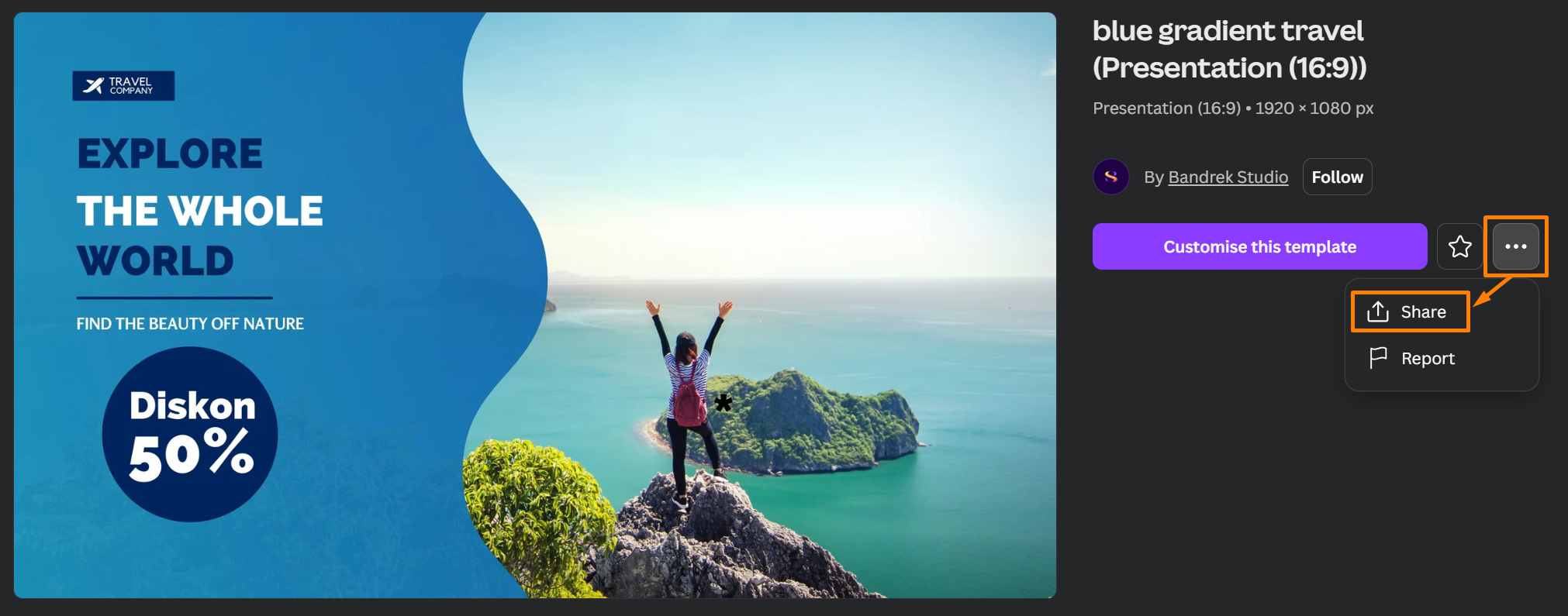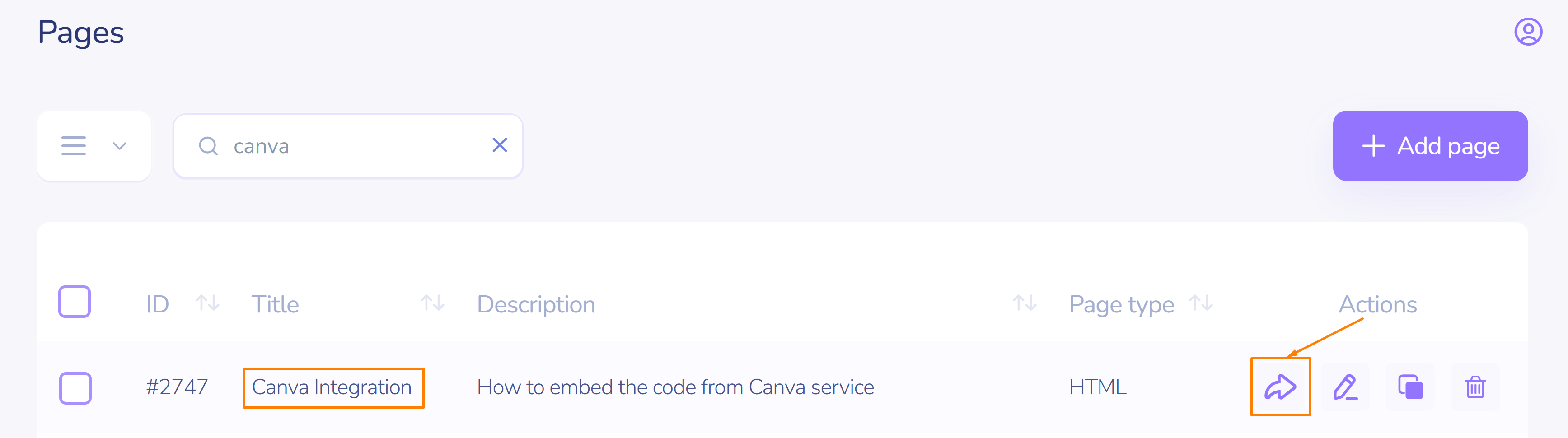 If you are not editing the Canva service object but using a ready-made one, click the three dots button on the right, select Share, and the link will be copied automatically. This way, you simply insert a hyperlink.