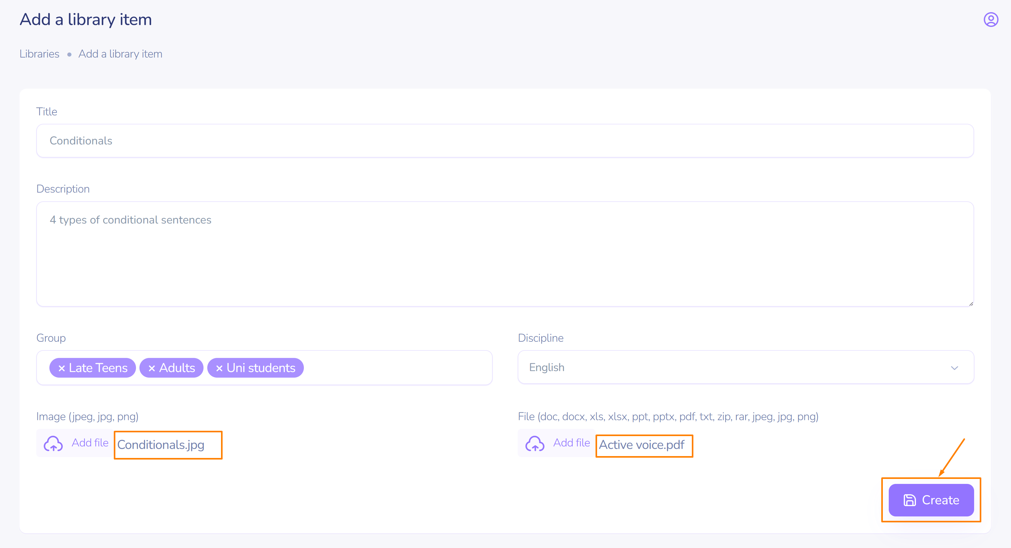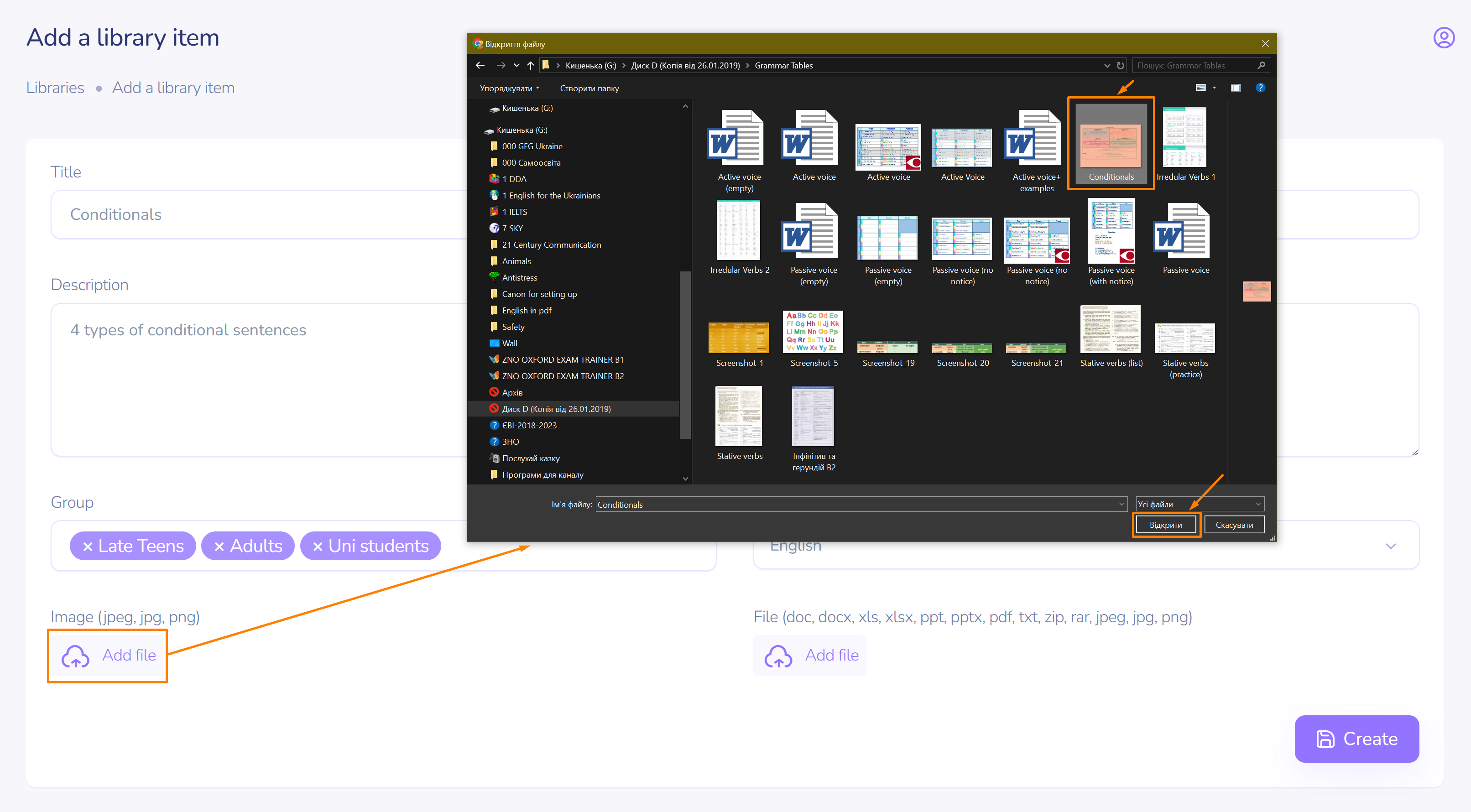 Adding files to a library item.